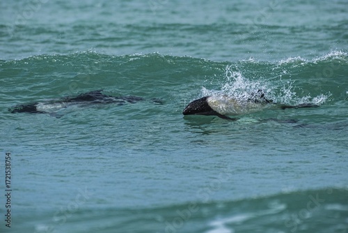 Commerson's dolphins (Cephalorhynchus commersonii), also known as Jacobita or Tonina, surfing in a wave. Pebble Island, Falkland Islands, Great Britain, South Atlantic