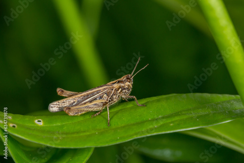 Common field grasshoper sitting on a green leaf macro photography in summertime. Common field grasshopper sitting on a plant in summer day close-up photo. Macro insect on a green background.