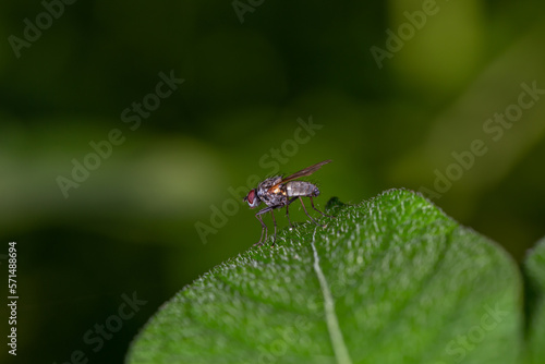 Common green bottle fly sitting on a green leaf macro photogrpahy. Green blowfly sitting on a plant close-up photography in summertime.