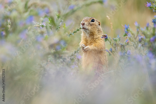 Common ground squirrel on blooming meadow. European suslik. Spermophilus citellus. Wildlife animal in the nature habitat. Little park in the middle of the rush city.