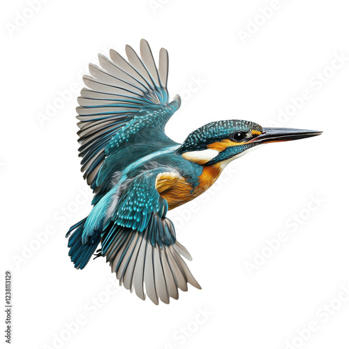 Common kingfisher bird in flight with wings spread on a transparent background, showcasing vibrant blue and orange plumage, a concept of wildlife, nature, and ornithology