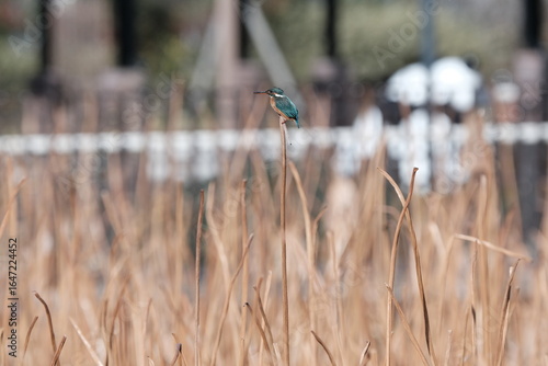 Common Kingfisher Perched on Withered Lotus Leaf, Tokyo, Japan
