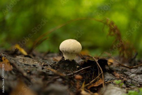 Common puffball mushrooms in group growing on the forest floor