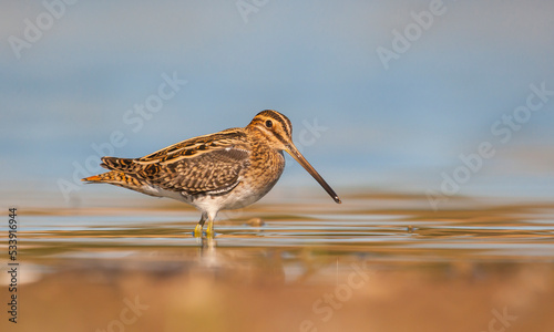 Common Snipe (Gallinago gallinago) is is a bird that lives in wetlands and feeds on aquatic invertebrates.