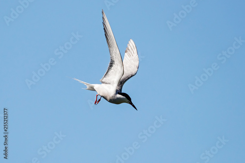 Common tern flying under blue sky looking for fish. Cute agile fast waterbird. Bird in wildlife.