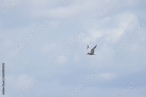 Common tern in flight with wings spread, common tern with wings spread and gray sky, Sterna hirundo, flying common tern with gray clouds in the background