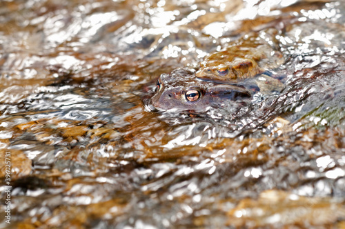 Common toad (Bufo bufo) mating couple in the Cinque Terre National Park, Italy.