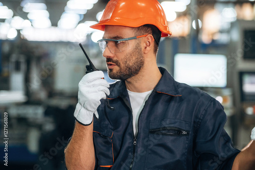 Communication by the radio, walkie talkie. Man is working in the modern factory