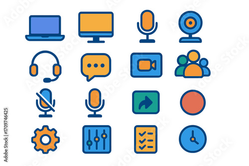 Communication flat icon set. featuring laptop, monitor, microphone, webcam, headset, chat, video call, group, settings, clock