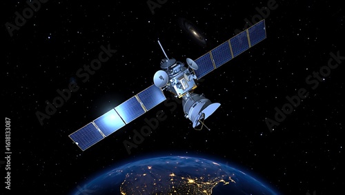 Communication Satellite Orbiting Earth in Deep Space with Stars and Galaxy Background for Telecommunications and Technology Industries