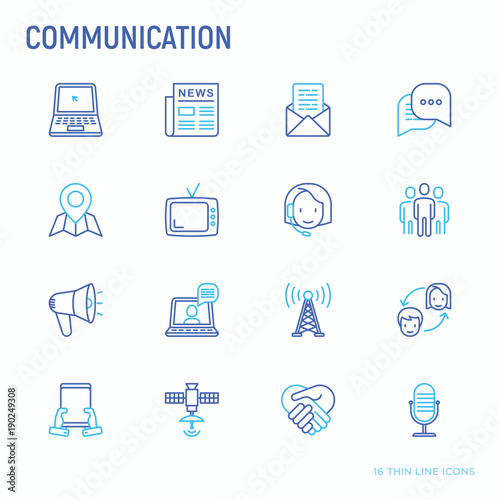 Communication thin line icons set: e-mail, newspaper, letter, chat, tv, support, video call, microphone. Modern vector illustration.