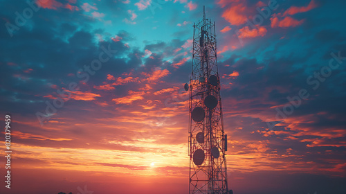 Communication tower against the background of the sunset sky. Communication concept.