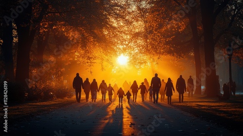 community a big family at the park a sizable gathering of people strolling in unison while admiring the park s sunset big family kid dream concept people in the park large sunlight famil