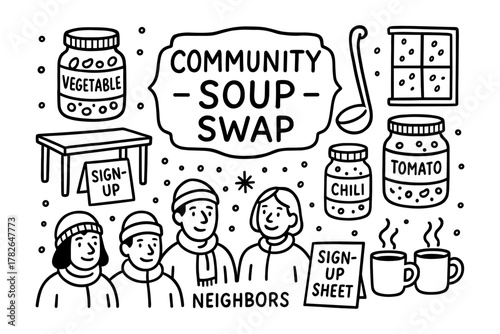 Community soup swap event with neighbors and homemade jars in winter doodle style