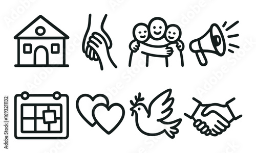 Community support linear icon set. featuring house, hands, group, megaphone, calendar, hearts, dove, handshake.