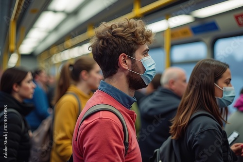 Commuters wearing masks on public transit during pandemic rush hour
