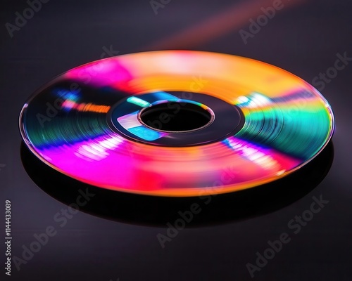 Compact disc with vibrant reflection, soft lighting, sleek design