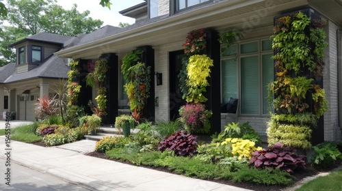 Compact front yard landscaping using vertical planters, compact shrubs, and bold foliage plants