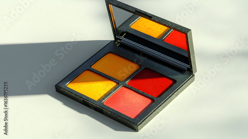 Compact powder palette with dual colors, featuring vibrant shades of yellow and red, is displayed open with mirror. palette is set against neutral background, casting soft shadow