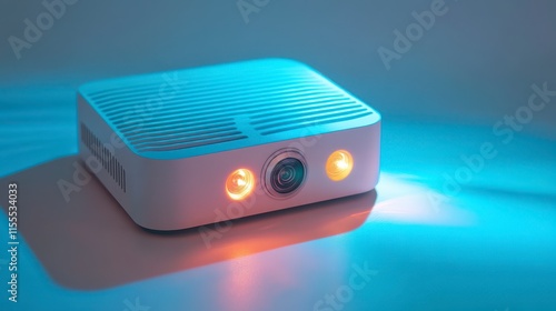 Compact white device with illuminated sensors on a blue surface.