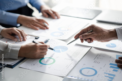 Company meeting room has businessmen and finance managers meeting together on finance topics, they are looking at information on documents and discussing together. Concept company financial management