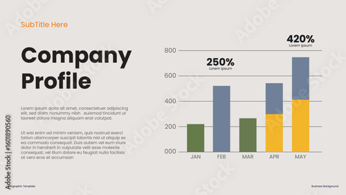 Company Profile Document Featuring Colorful Data Charts and Growth Statistics in a Professional for presentations diagram template, process, chart workflow, banner layout, info graph concept