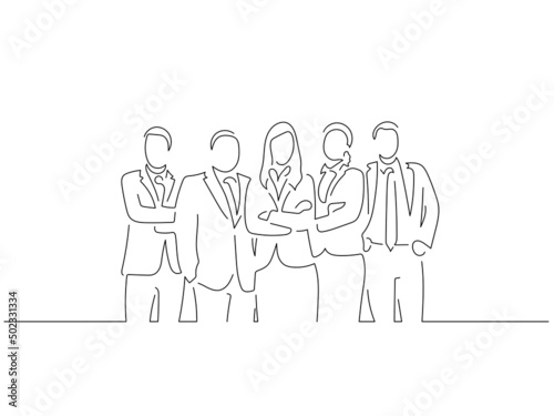 Company work team in line art drawing style. Composition of a group of business people doing their job. Black linear sketch isolated on white background. Vector illustration design.