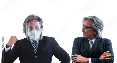 Comparing images of people on white Background, Asian senior man wear protective screens and masks, prevent Covid-19 or coronavirus infection, new normal lifestyle