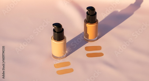 Comparing liquid foundation shades with cosmetic swatches. Two pump bottles for beauty and makeup application.