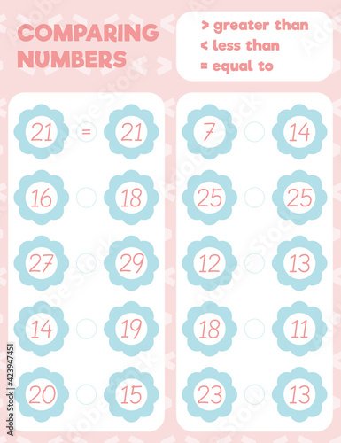 Comparing numbers worksheet practice print sheet. Vector illustration.
