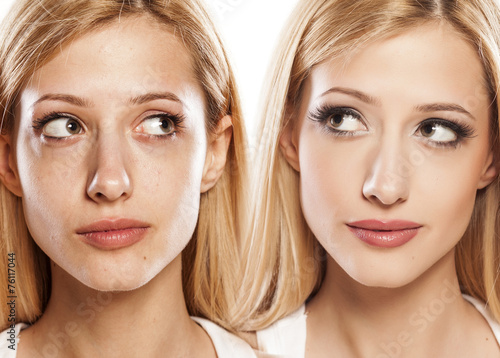 Comparison portrait of a woman without and with makeup
