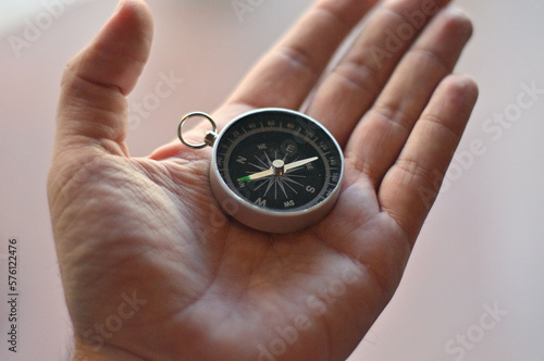 Compass in hand blur background