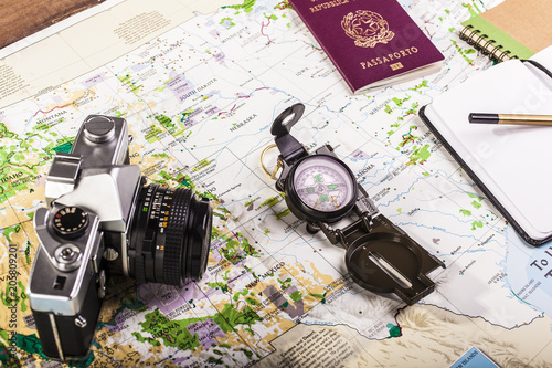 Compass, passport, photo camera and block notes on map