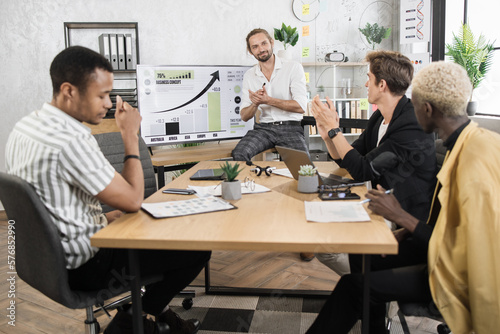 Competent financiers businessmen with modern gadgets on table celebrating successful completion of project. Multi ethnic male partners in formal clothes applauding together while sitting at office.