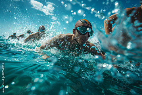 Competitors Race Through Crystal Clear Waters in Intense Triathlon Swim Event at Sunny Coastal Venue