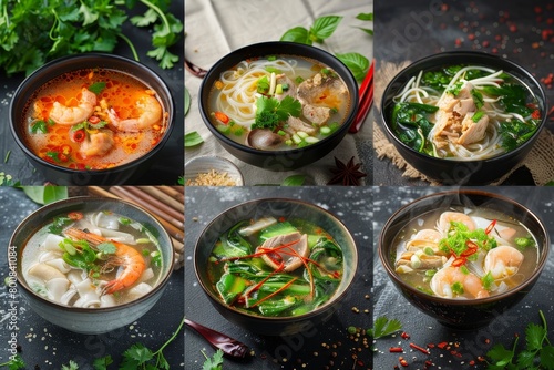 Compilation of traditional Vietnamese soups with chicken seafood and beef