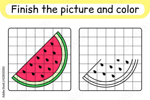 Complete the picture watermelon. Copy the picture and color. Finish the image. Coloring book. Educational drawing exercise game for children