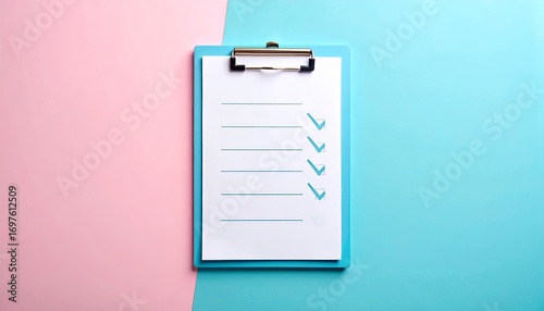 Completed checklist on a clipboard with a pastel background divided in two colors