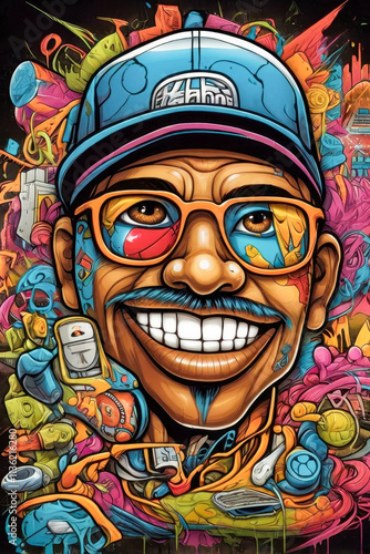 Complex and rich composition in graffiti style, combining bright colors, diverse images and elements of urban culture. Street art, contemporary artwork.