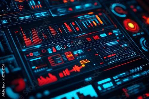 Complex digital dashboard with glowing indicators