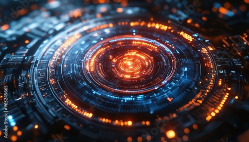Complex holographic interface with spinning gears, glowing blue and red, dynamic depth, digital matrix