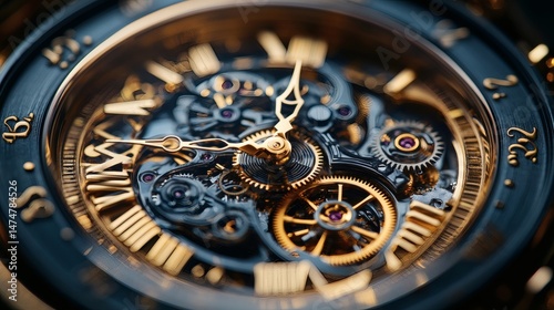 Complex inner workings of golden toned mechanical timepiece with intricate gears, springs, and jeweled accents revealed in extreme close-up