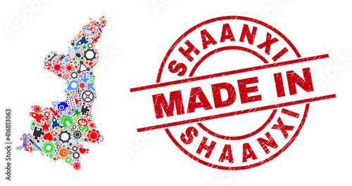 Component Shaanxi Province map mosaic and MADE IN distress stamp seal. Shaanxi Province map composition created from wrenches, wheels, instruments, elements, cars, power strikes, rockets.