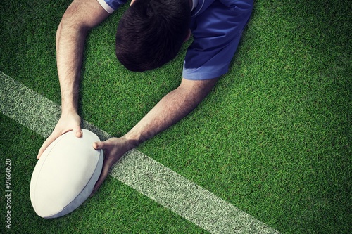 Composite image of a rugby player scoring a try
