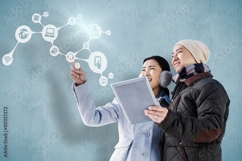Composite image of couple looking away while holding tablet