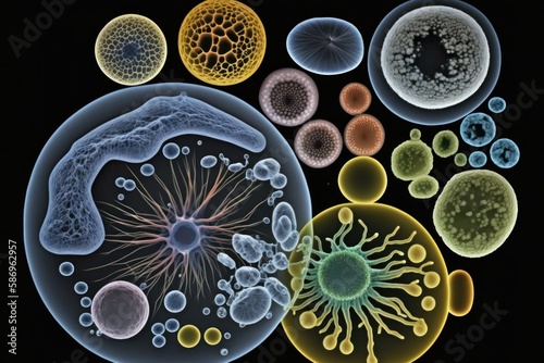 composite image of human cells and microorganisms various sizes created with Generative AI technology