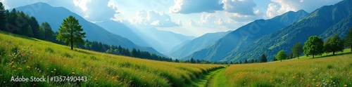 Composite image of large meadow with herbs and trees in mountain area, transitioning from day to night, field, herbs