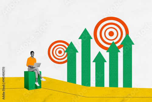 Composite photo collage of happy american girl freelancer type laptop arrow development target goal isolated on painted background