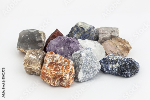 composition of various crystals on white background.