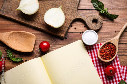 Composition with blank recipe notebook and ingredients on wooden background